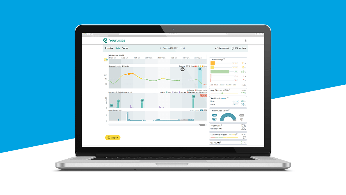 YourLoops est une application de visualisation de données, intégrée aux solutions développées par Diabeloop. Elle permet aux personnes équipées du DBLG1 System de partager leur données, si elles le souhaitent, avec leurs proches et/ou leur équipe de soin.